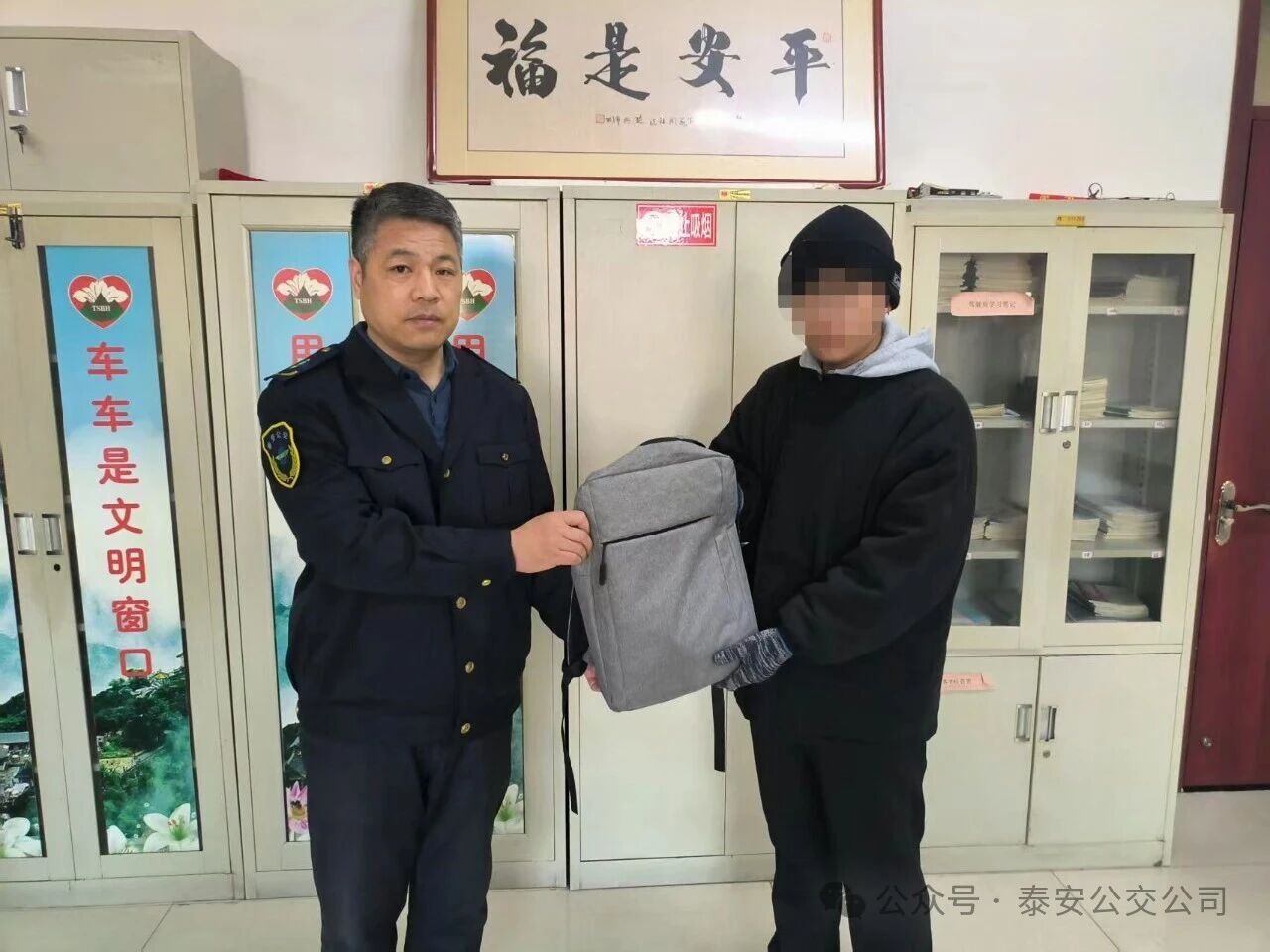 近日,泰山職業(yè)技術學院的齊同學專程來到泰安公交第三分公司,順利領回了自己失而復得的背包。看著背包內價值5000余元的筆記本電腦和父母給的200元現金分文未少,齊同學難掩激動,連連對39路公交車駕駛員侯同尚及分公司工作人員的熱心幫助表示感謝。